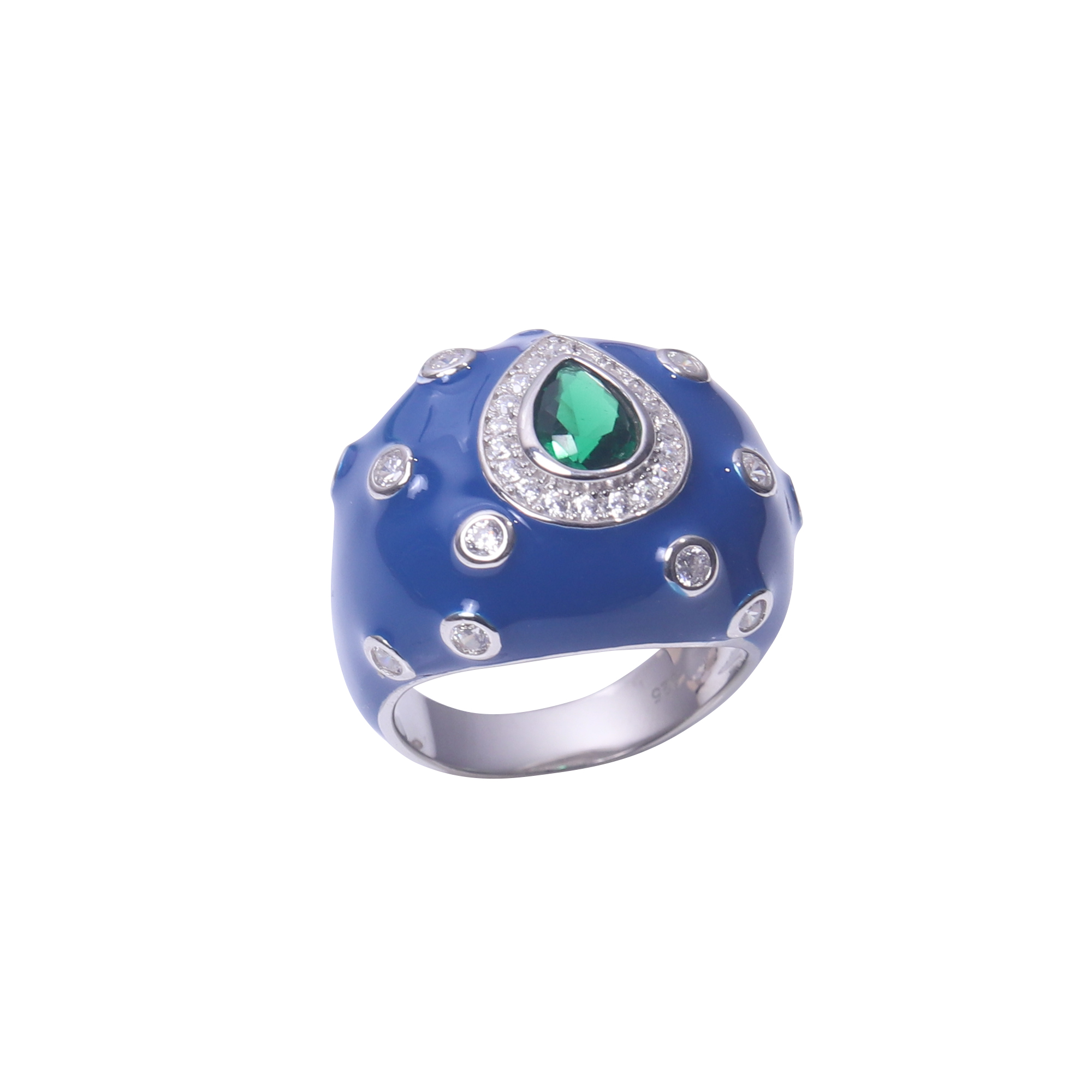 This striking statement ring features a bold, deep blue enamel dome accented with shimmering bezel-set crystals. At its heart lies a vibrant emerald-green teardrop stone, encircled by a brilliant halo of pavé-set gems for a truly regal finish.