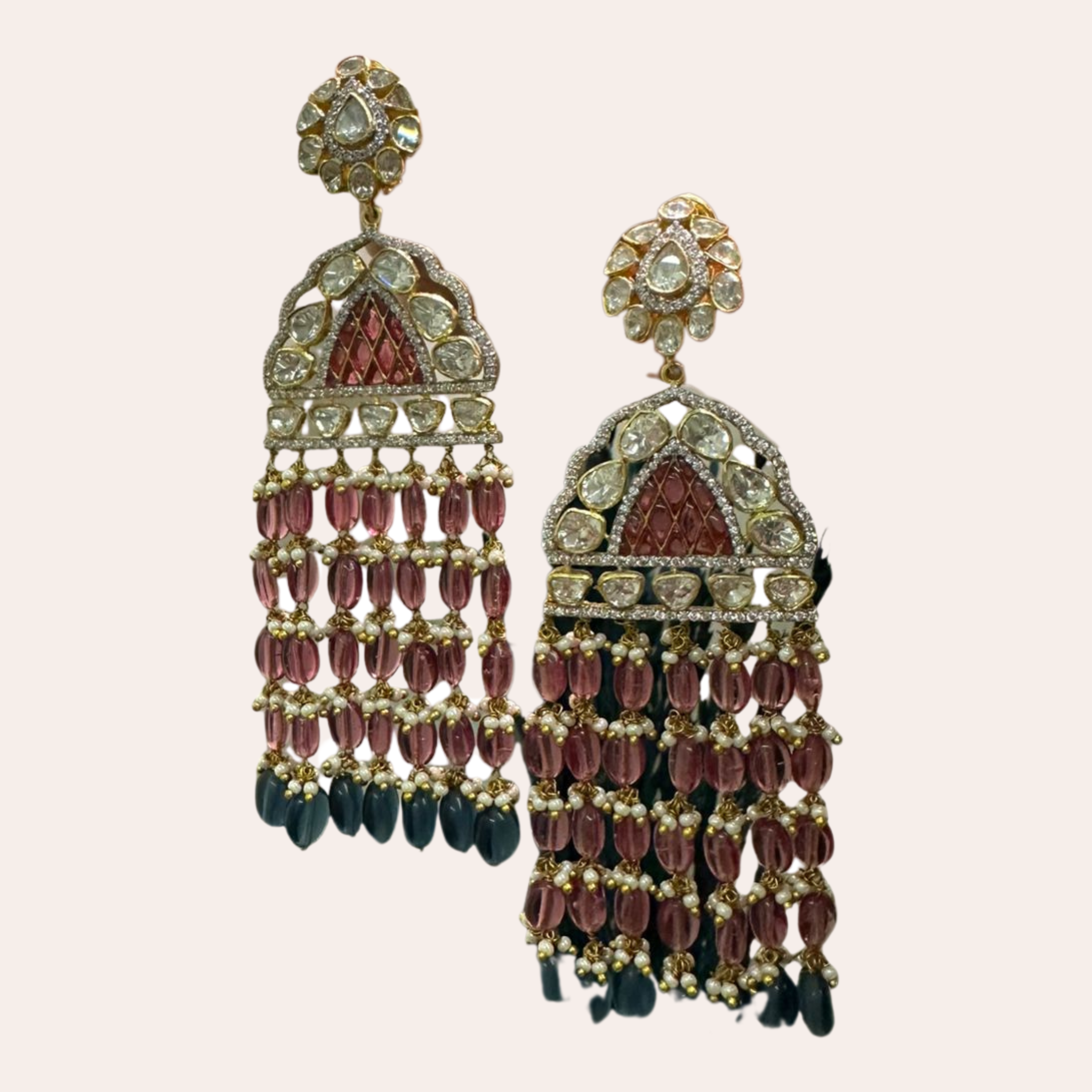 Elegant jharokha-style earrings with kundan stones, pink beads, pearl accents, and teal drops. Lightweight statement jewelry for festive and ethnic wear.