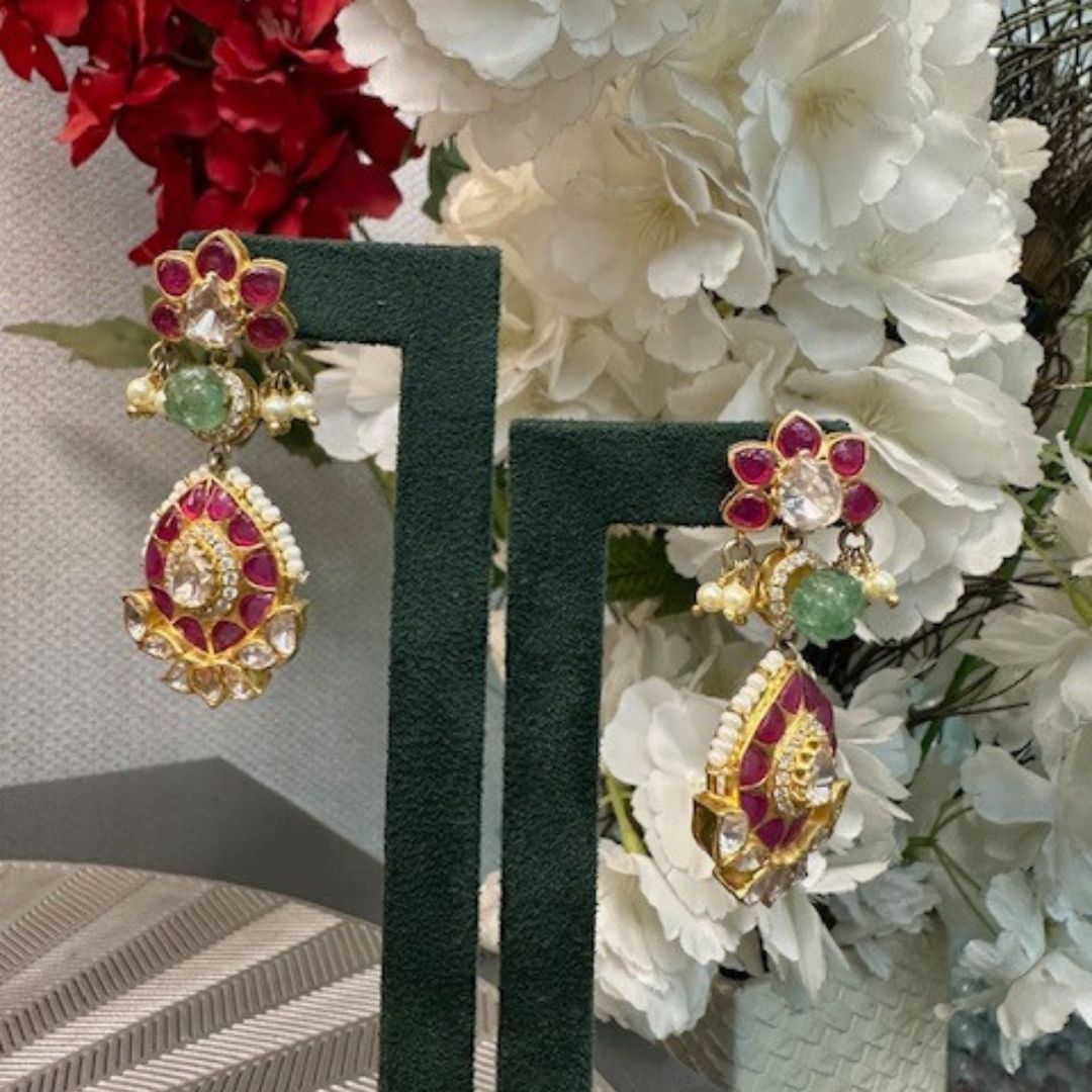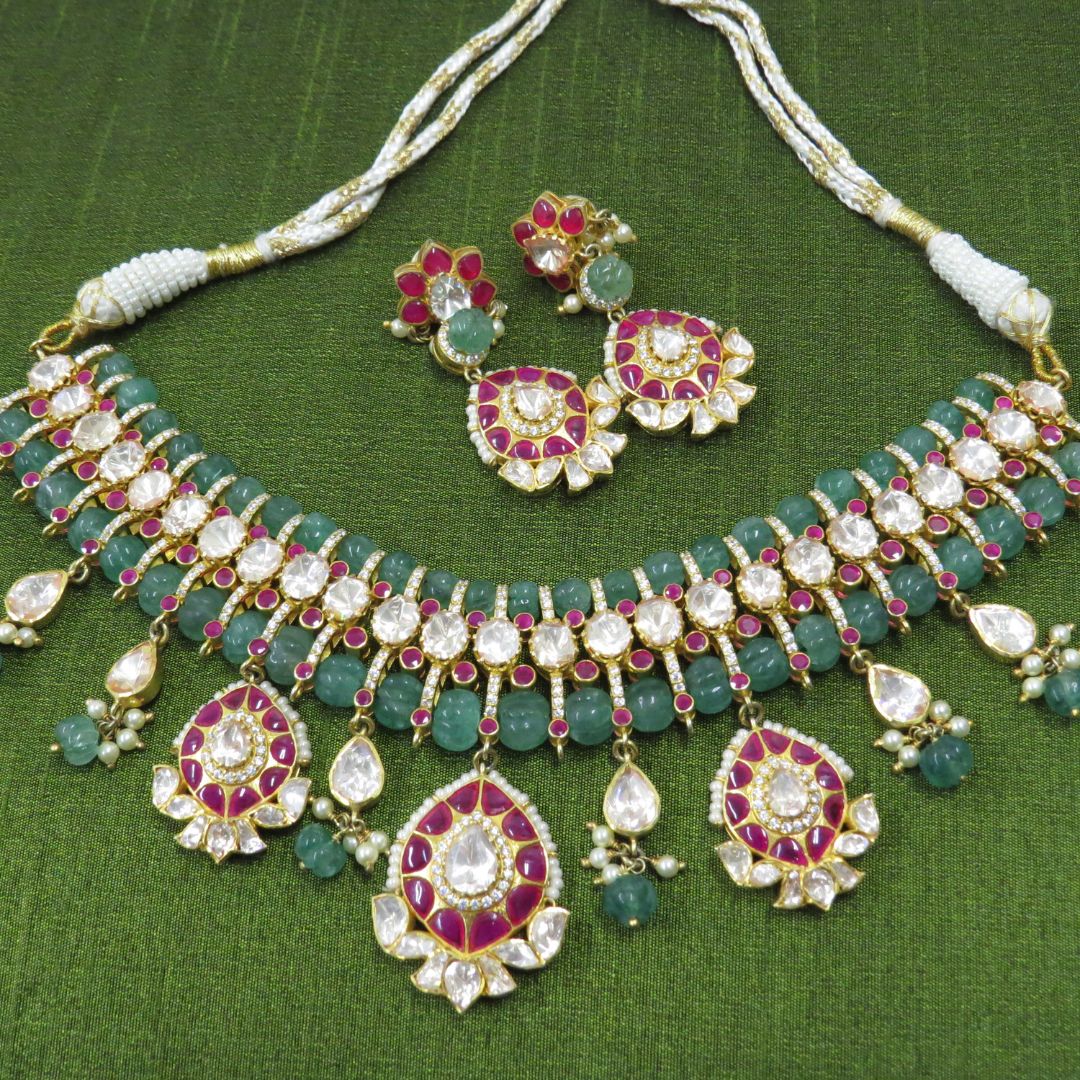 This magnificent set showcases a beautiful Kundan necklace with ruby-hued stones, brilliant polkis, and emerald-beaded layers. Matching earrings complete the opulent look for a truly royal statement.