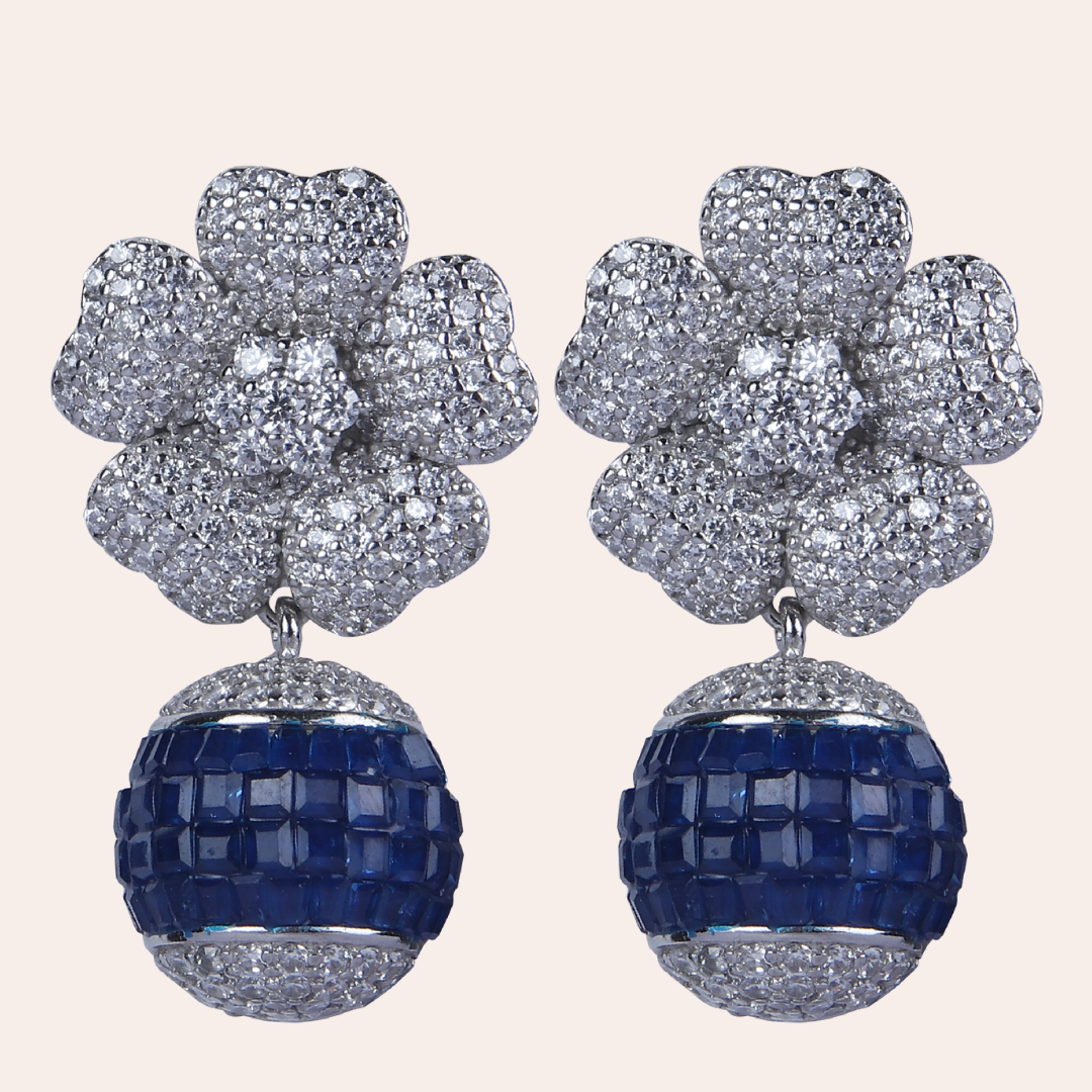 The Sapphire Bloom Drop Earrings feature a dazzling crystal-studded flower paired with a bold sapphire-blue sphere. Elegant and striking, they add timeless glamour to evening looks and special occasions.