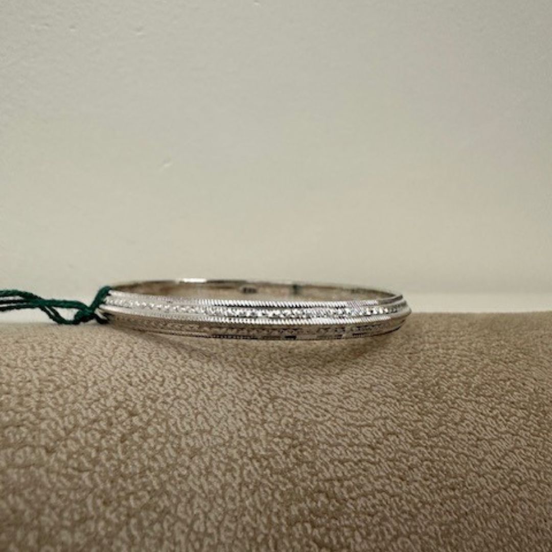 This elegant bangle features a polished silver finish with intricate textured detailing around the edges, adding depth and sophistication. Perfect for a classic yet distinctive look, either worn alone or stacked.