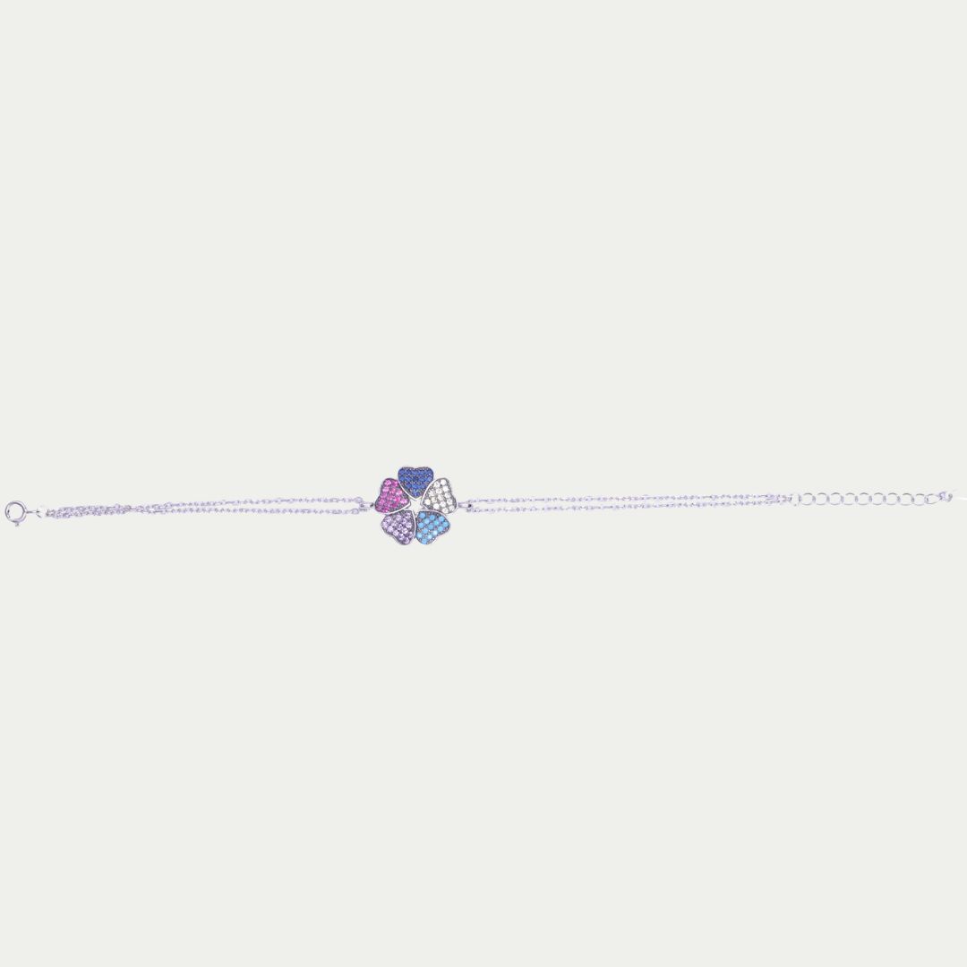 Add charm with this silver-tone double chain bracelet featuring five sparkling heart-shaped petals in pink, blue, purple, and champagne. Playful yet elegant, it’s perfect for gifting or styling, bringing a cheerful, colorful touch to any outfit
