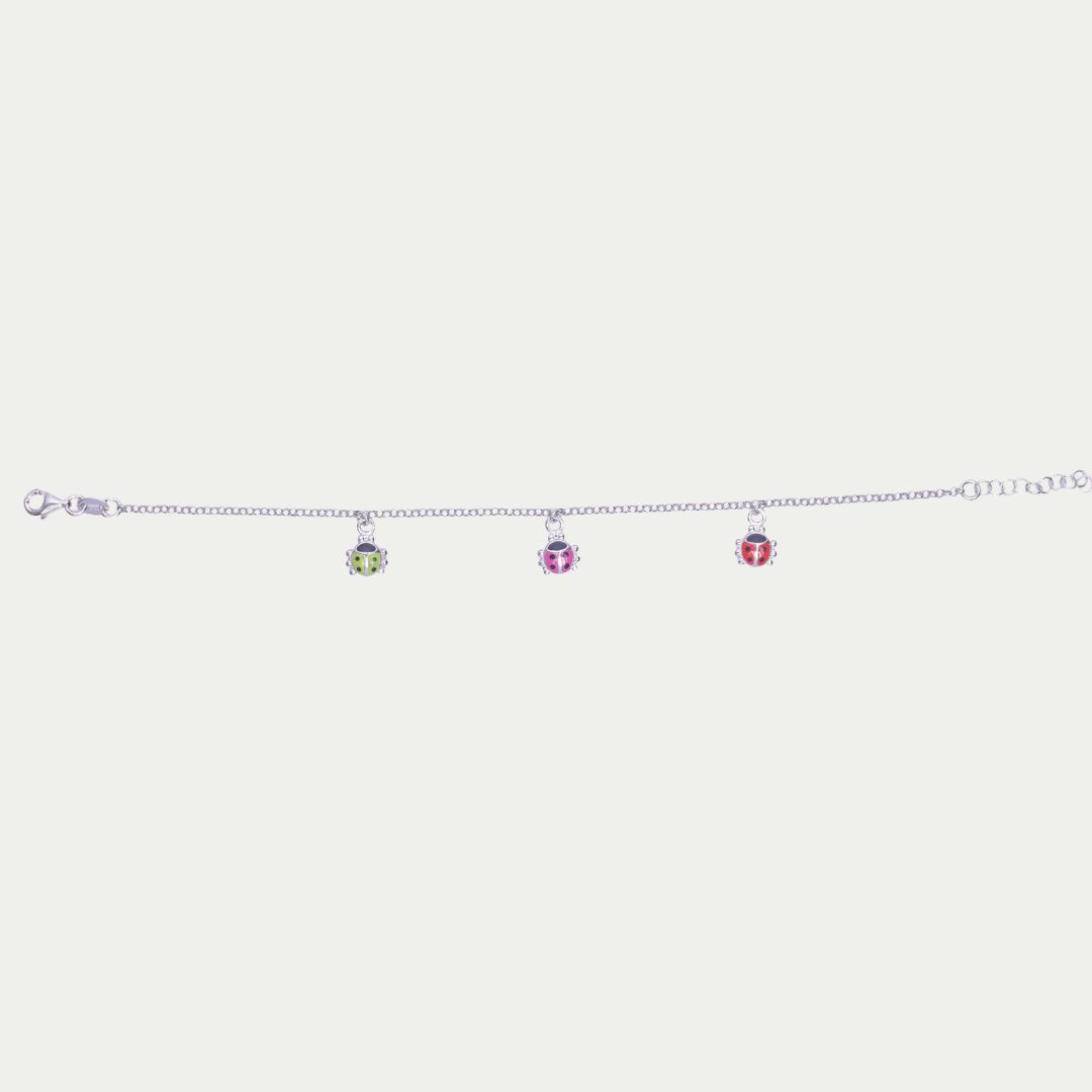 Add a playful twist to your style with this anklet featuring adorable enamel ladybug charms in vibrant green, pink, and red on a sleek silver-tone chain. A cheerful, colorful accessory perfect for summer, vacations, or everyday fun.