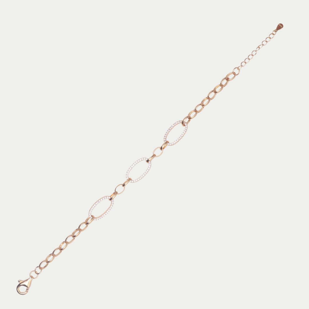 Elevate your look with the Gilded Oval Link Bracelet. Polished rose-gold oval links form a stylish chain, highlighted by a larger crystal-encrusted link for sparkling elegance. Perfect for casual wear or special occasions, it blends modern design with timeless glamour.