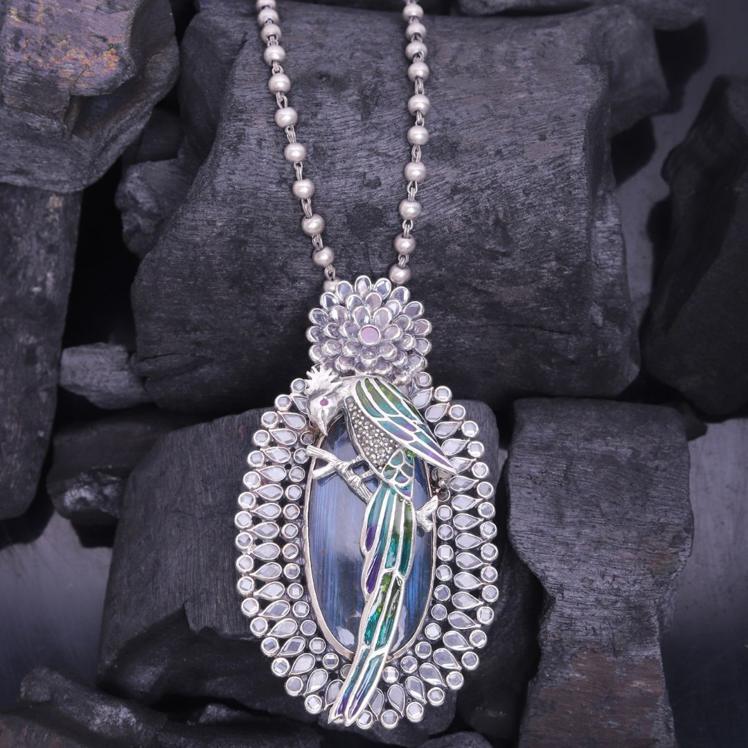 The Mystical Parrot Statement Necklace features a silver-toned beaded chain with an oversized gemstone pendant, enameled parrot, and dazzling crystal border. A bold, artistic piece for unforgettable elegance.