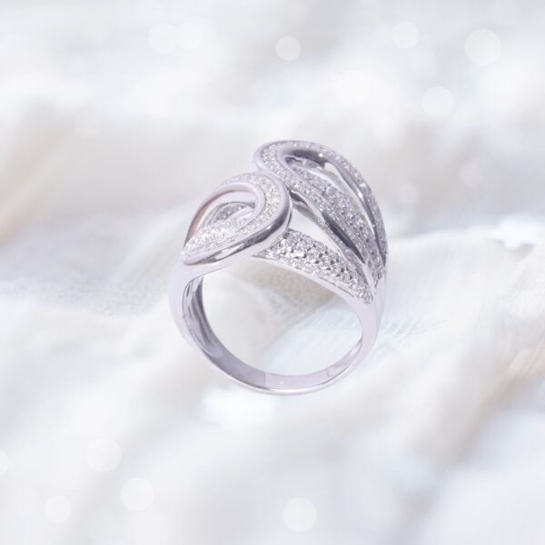 Wrap your finger in brilliance with the Serpentine Sparkle Statement Ring. Featuring swirling, overlapping bands encrusted with pave-set crystals, its polished silver tone creates a sleek, continuous shimmer. A bold piece of contemporary glamour for any occasion.