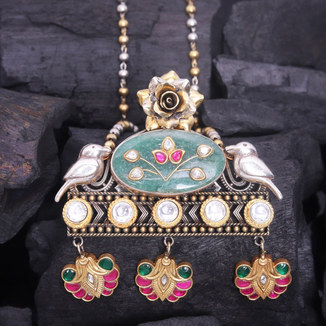 The Rose Gemstone Necklace features a dual-toned beaded chain with a gold rose, jade-green stone, silver birds, crystal row, and lotus charms. A vibrant, artistic piece that exudes handcrafted luxury and charm.