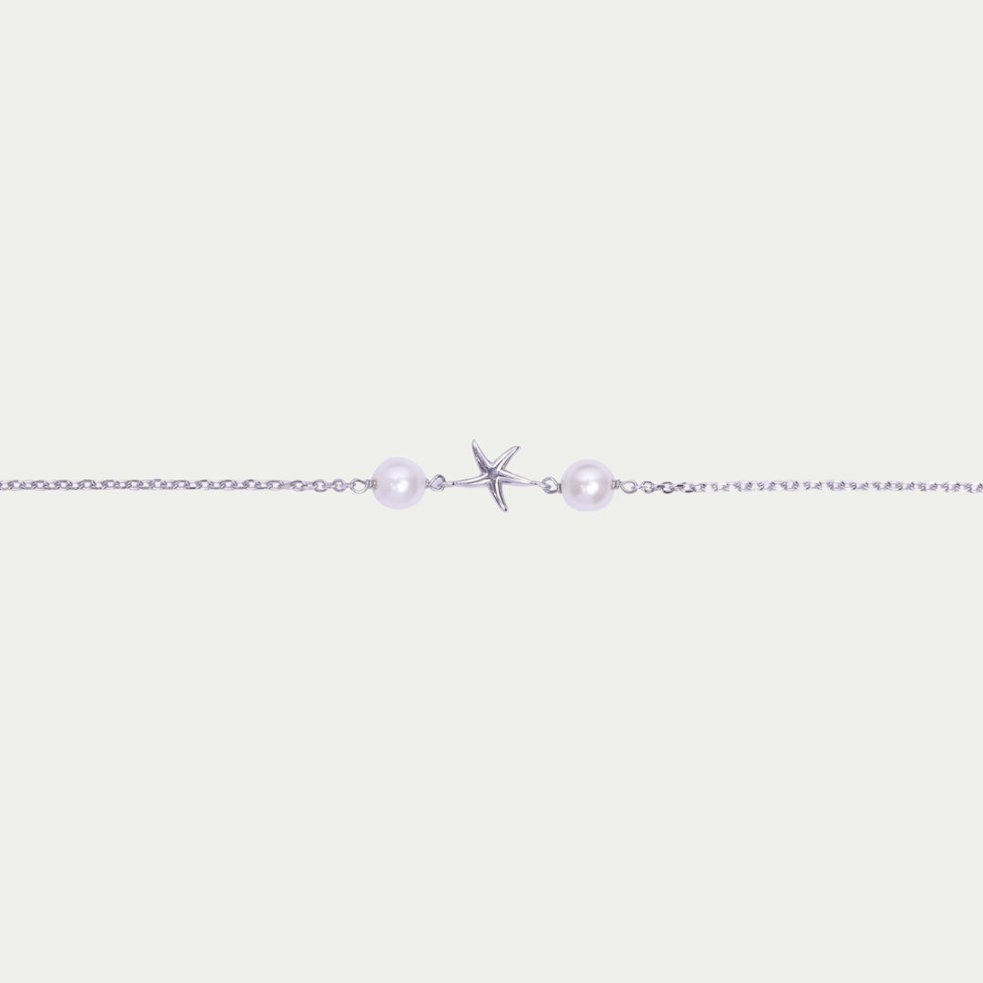Embrace coastal elegance with a silver-tone chain featuring a starfish charm and two luminous faux pearls. Inspired by the ocean’s beauty, it’s perfect for summer styling or gifting, adding a graceful marine-inspired touch to any outfit.