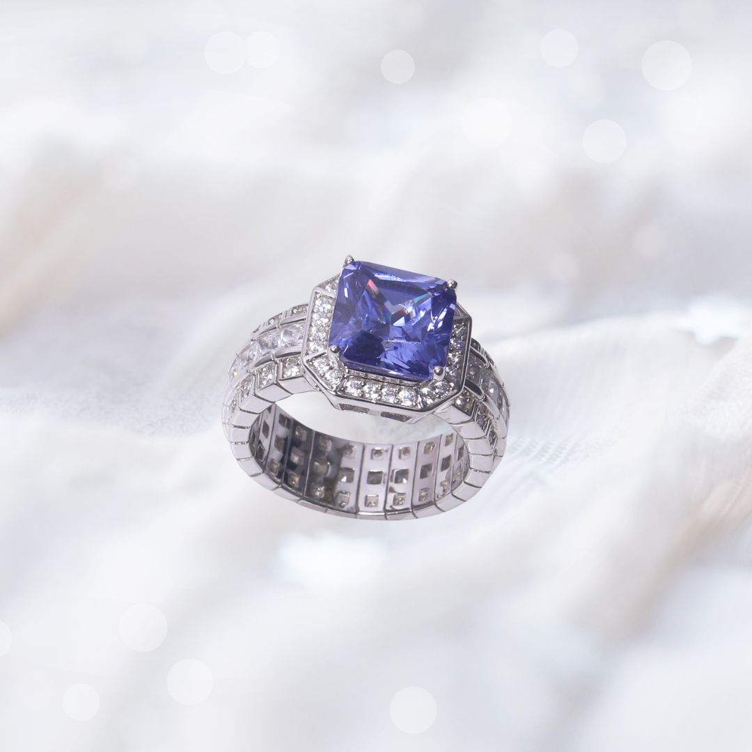 Adorn your finger with the Tanzanite Halo Cushion Ring, featuring a cushion-cut violet-blue tanzanite gemstone framed by a halo of clear crystals. A pave-set crystal band adds extra brilliance, while the polished silver-toned setting exudes elegance and glamour.