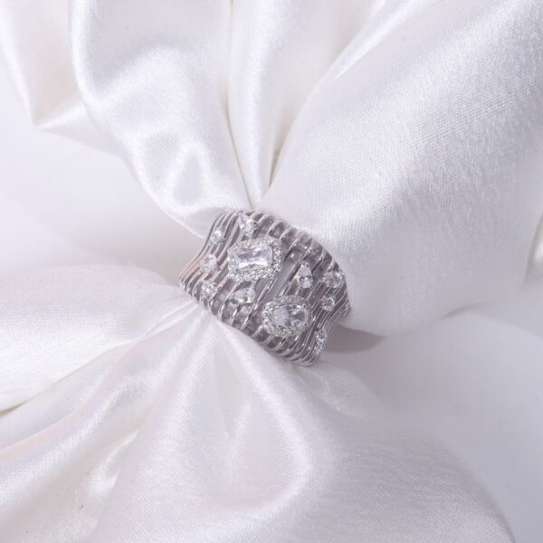 Adorn your finger with the Textured Lumina Statement Ring, featuring a ridged silver band and sparkling crystals in oval, marquise & round cuts. A bold, modern piece that adds glamour & style to any look.